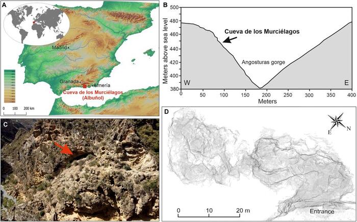 Археологический памятник Куэва-де-лос-Мурсьелагос. (A) Расположение пещеры на юго-востоке Испании (Андалусия, Альбуньоль). (B) Профиль высоты (с востока на запад) ущелья Ангостурас. (C) Вид с севера на ущелье Ангостурас и вход в пещеру. (D) План пещеры, выполненный с помощью 3D-модели. Ист.: F. Martínez-Sevilla et al. Science advances, 2023.