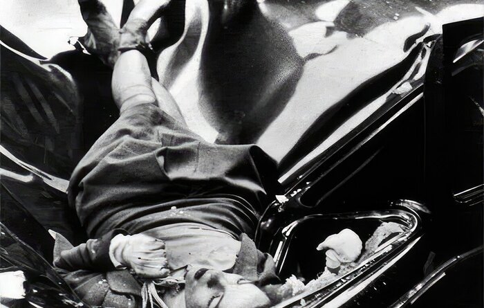 Вероятно, мать с дочкой нашли уединённое место у строительной техники, чтобы женщина могла спокойно позагорать топлес, что в консервативной Британии 1980-х всё ещё вызывало смешанные реакции.