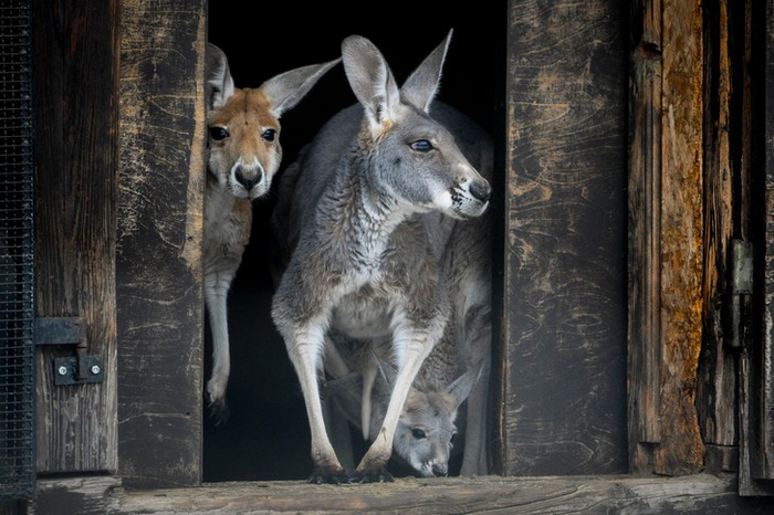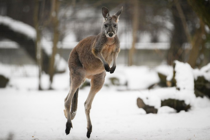 Кенгуру из Варшавского зоопарка (Польша) без энтузиазма смотрят на фотографа и не радуются выпавшему снегу, предпочитая проводить время в укрытии.