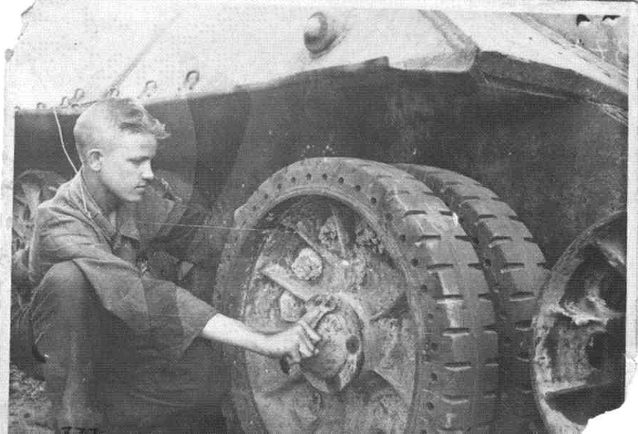 Май 1943 года. На фото ученик первого ремесленного училища Сталинграда: пока цеха завода не восстановлены после бомбежек, ремонт танков ведется прямо на улице