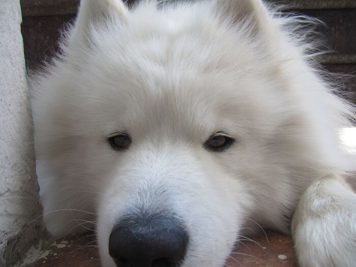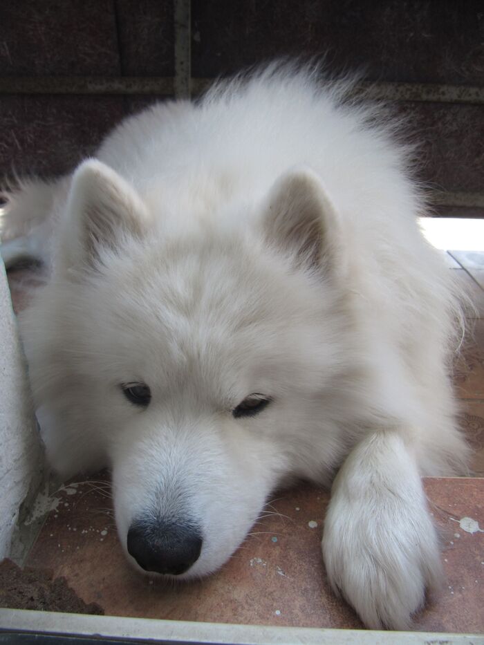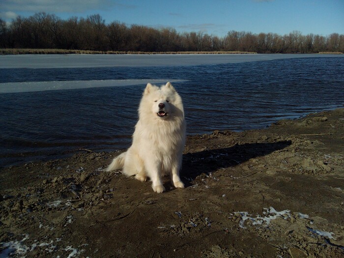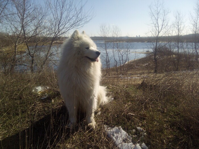 Встретили на прогулке шпица. Тот постоянно выпрашивал вкусняшку. Мой самоед периодически старался прекратить это безобразие в виде раз\сдачи вкуснях чужим собакам :)