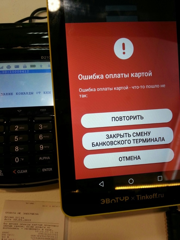 Поставили мы онлайн кассу ЭВАТОР и терминал PAX D210E от Тинькофф. Первые 2 дня все работало отлично, терминал привязан к кассе и проблем с безналичным расчетом не было.