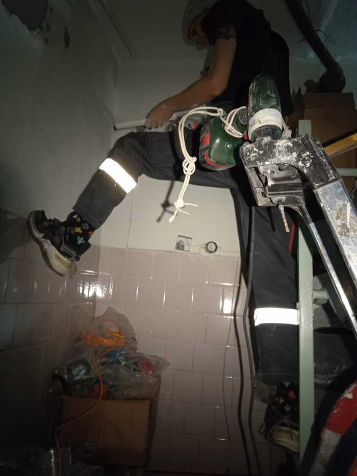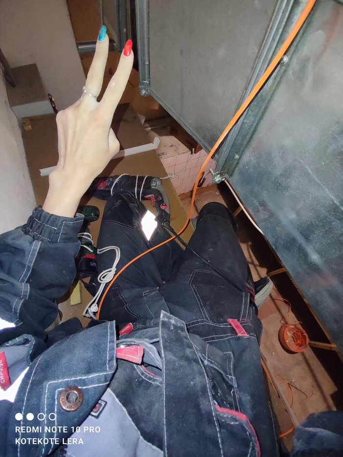 Здесь штроблю. Для далёких от стройки - делаю канавки в стене под провода. Пылищи там много) и это громко. Поэтому только так.