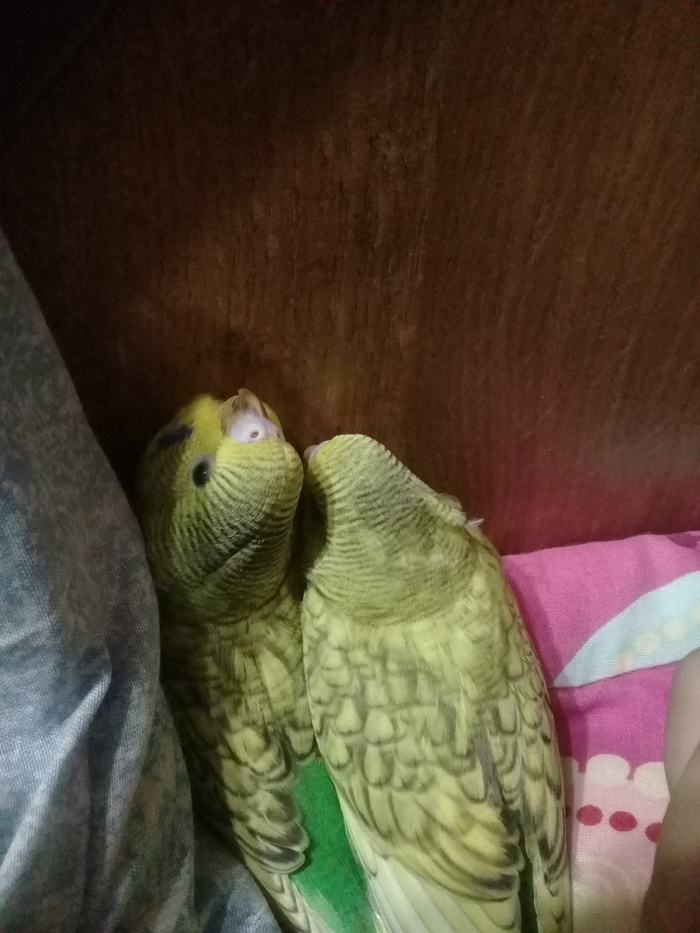 Это родители. Мама желто-зеленая. Но пока ни на одном из малышей не видно голубых перьев. Неужели все в маму будут?