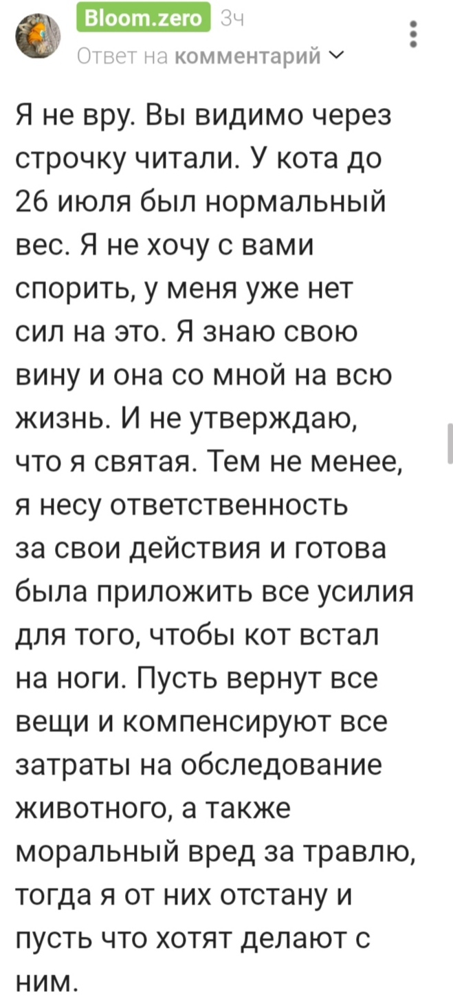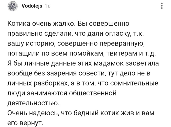Финал моей истории таков. Я не знаю для чего данные женщины публиковали пост, полный недостоверной и непроверенной информации. Я не знаю почему Mash написал слова, которые мне не принадлежат. Хотя их сотрудник созванивался со мной и я рассказала все тоже самое, что написала здесь. Сейчас я хочу лишь здоровья коту и справедливого законного наказания Ирине и Инне за их действия. Даже если в глазах общественности я останусь "живодеркой".