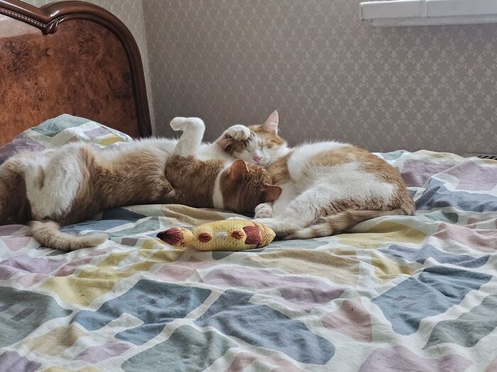 Филипп — теперь Кузя — уехал с ними в тот же день. Новые родители написали волонтёрам через несколько дней: котик немного грустит, мяукает по ночам. Волонтёры успокоили: это нормально, он привыкает, скучает по братьям, нужно просто время.