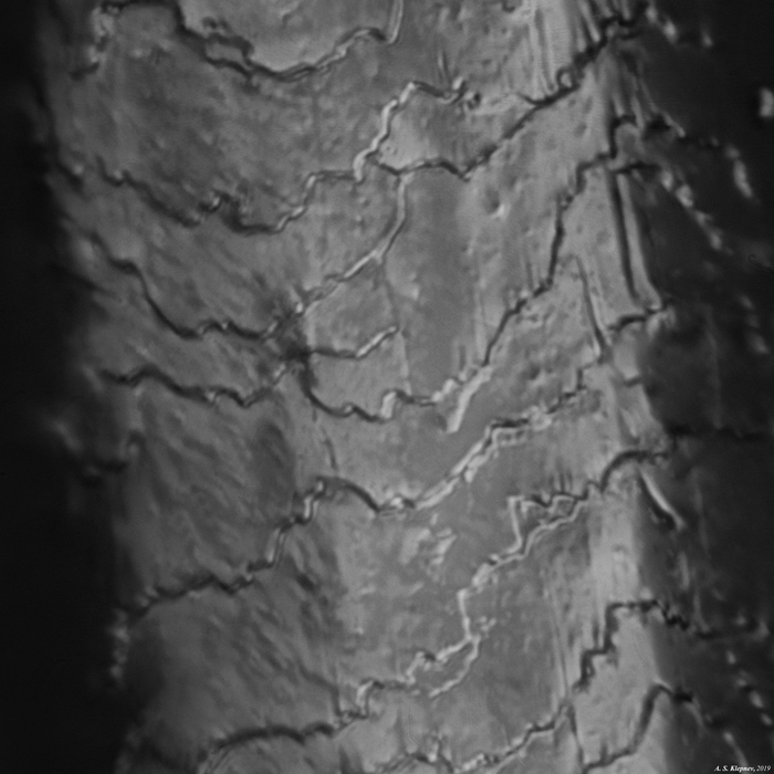 Вместо встроенной в корпус микроскопа подсветки воспользуемся обычной настольной лампой. Расположим её под предметным столиком микроскопа так, чтобы она освещала волос снизу, но под углом. В результате изображению вернётся естественный объём. Волос покажется уже не коричневой полоской, а, скорее, веткой дерева, с неровностями, изгибами и, внезапно, на некоторых участках мы увидим чешуйки!