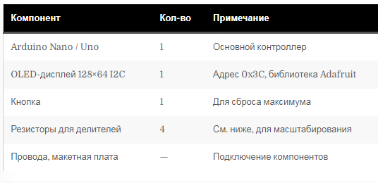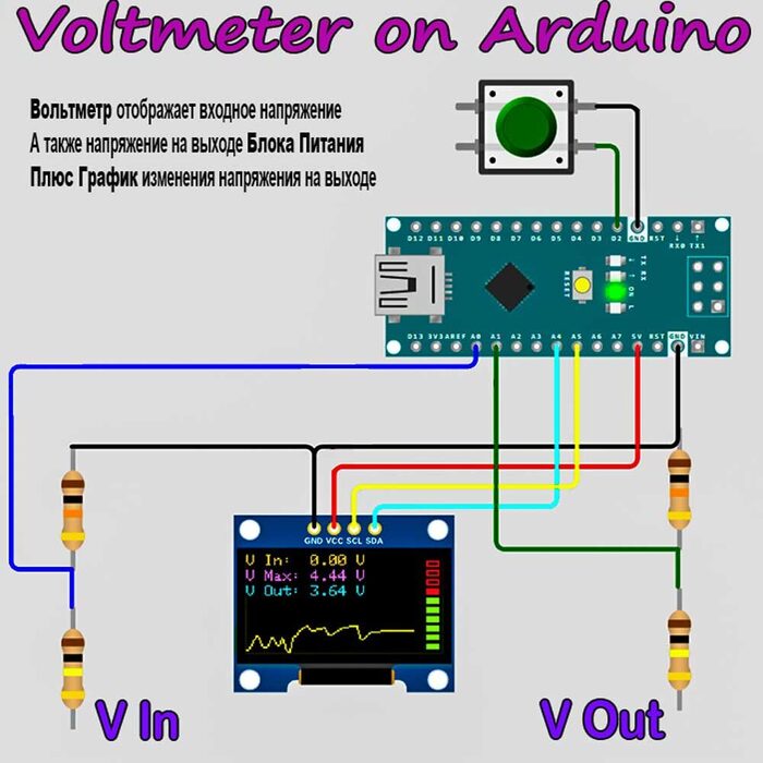Этот проект представляет собой двухканальный цифровой вольтметр на базе Arduino, предназначенный для одновременного измерения входного и выходного напряжения, а также отображения максимального зафиксированного значения и реального графика изменения напряжения во времени.