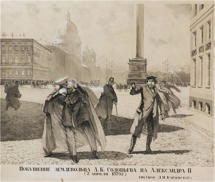 Покушение Александра Соловьева 2 апреля 1879 года. Рисунок Д.И. Кардовского. Источник: https://magisteria.ru/socialism/narodnaya-volya