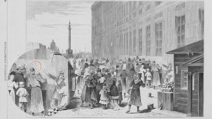Народ осмартивает место происшествия. Коллаж на основе изображения из "Всемирной иллюстрации"