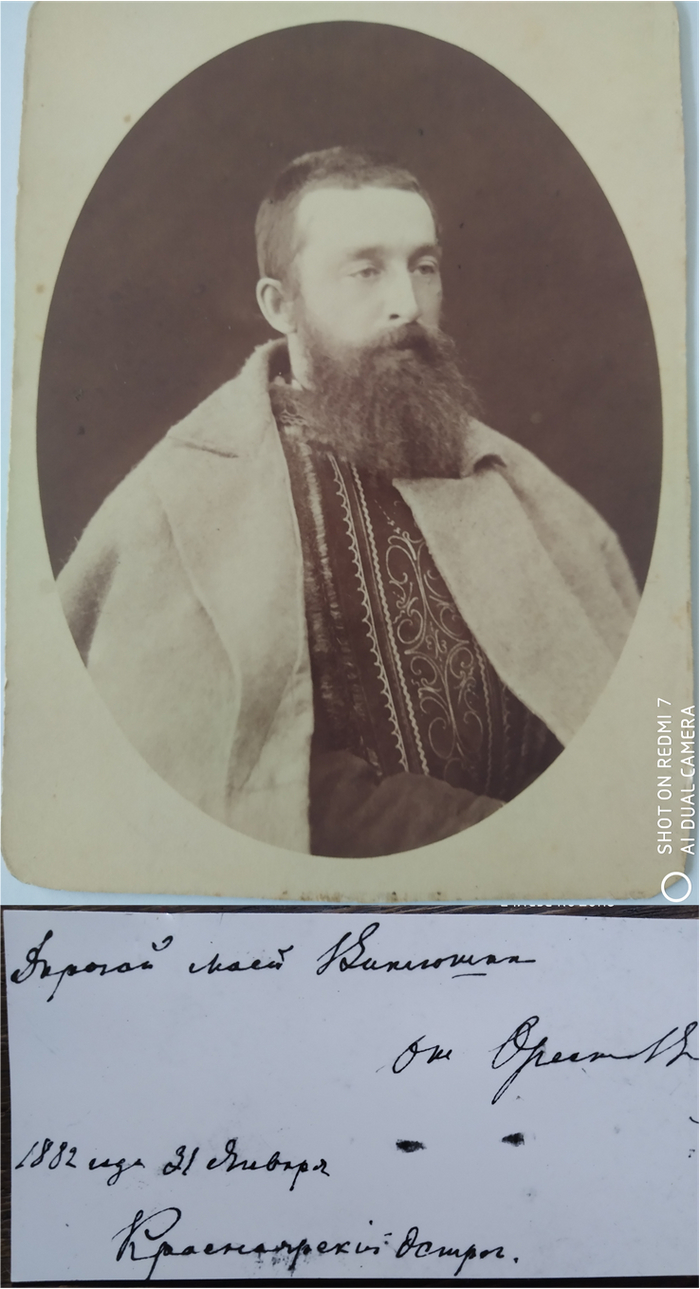 Фотография Ореста Веймара из Красноярского острога 31 января 1882 года, переданная Виктории Ребиндер. По надписи на обороте впервые удалось установить точное время и место съемки самой известной фотографии Веймара. Из личной коллекции Марианны Петровны Ребиндер. Фото предоставлено М.П. Ребиндер