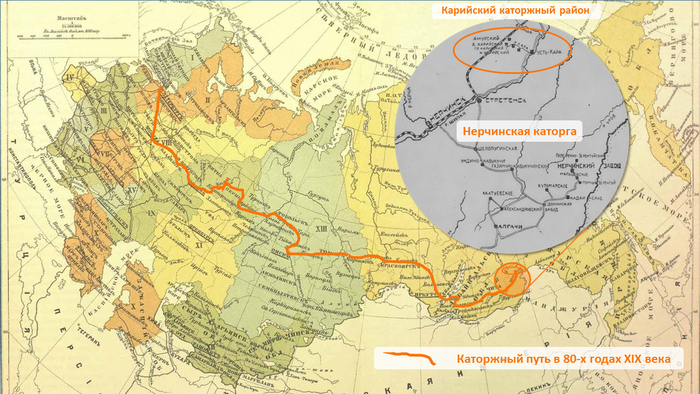 Сибирский каторжный путь. Составлен автором. На вставке схема Карийской каторги конца 19 века из книги «Кара и другие тюрьмы Нерчинской каторги». Карта из открытых источников.