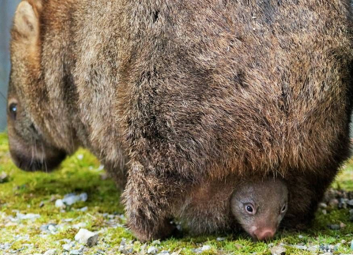 Зато мамочка из принцессы выходит заботливая и очень ответственная. Несмотря на то, что сосков у самки два, одновременно рождается и воспитывается лишь один детёныш. До восьми месяцев малыш растёт в сумке у мамы, а потом ещё год живёт на её территории под строгим родительским контролем. Сумки у вомбатов, в отличие от кенгуру, открываются назад, потому что маме нужно копать, и нельзя, чтобы земля набилась во временное жилище её отпрыска.