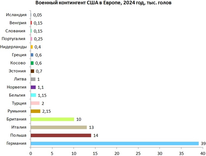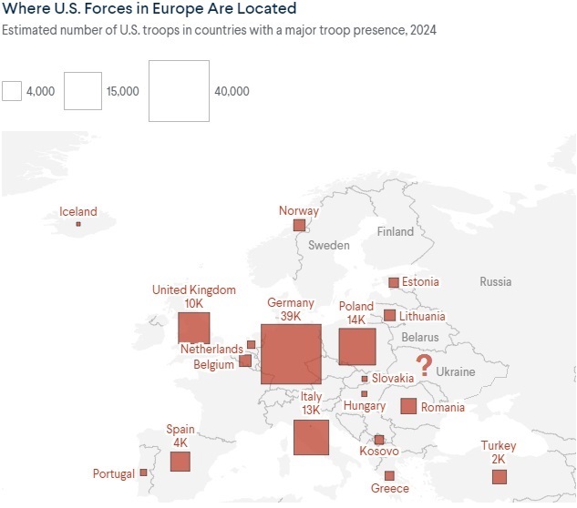 В период с 2008 по 2022 год размер американского контингента в Европе составлял примерно 65 тыс. Согласно данным Европейского командования ВС США, по состоянию на начало 2025 года в Европе дислоцировано около 84 тыс. американских военнослужащих. Однако с 2022 по 2024 год численность войск колебалась от 75 до 105 тыс., это связано с учениями, ротацией и акциями устрашения в адрес Белоруссии и России.