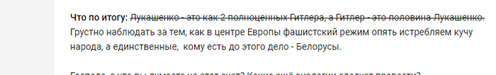 Модератор по своему убеждению решает,что достоверно, а что нет. Как видим для модераторов геноцид=милицейскому произволу, а авторитарный режим= фашистскому. Но если оппоненты их политического курса будут называть "проект реформ для Тихановской" программой, то рубим сразу за час =). Верим в свободный интернет дальше.