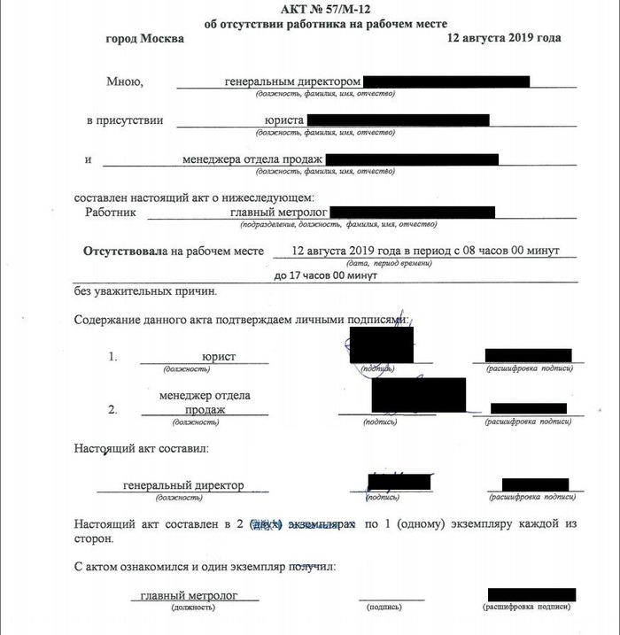 P. S. Разговаривал сам с менеджером и юристом. Менеджер говорит, что подписался только под тем, что отсутствовала на рабочем месте и что ему так сказал сделать директор и все вопросы к директору по этому поводу. Юрист говорит, что все сделал в соответствии с ТК и все нормально; если есть какие-нибудь вопросы, то пусть с этим разбирается суд. И оба уверены,что все сделали правильно и им за это ничего не будет.