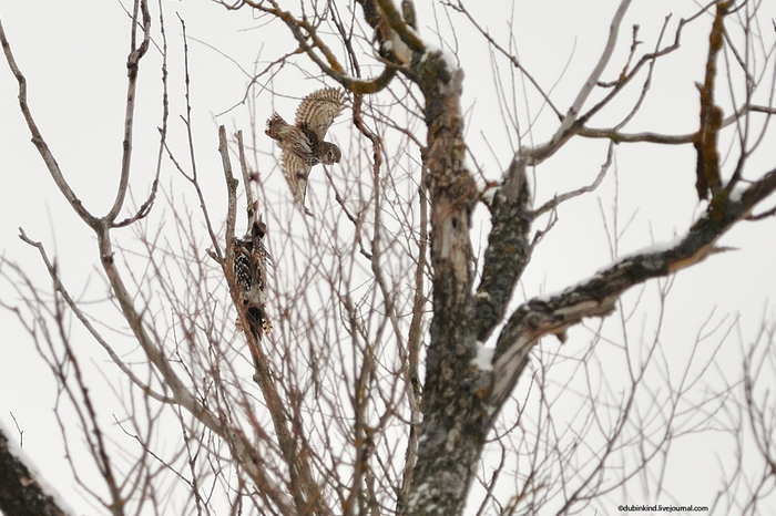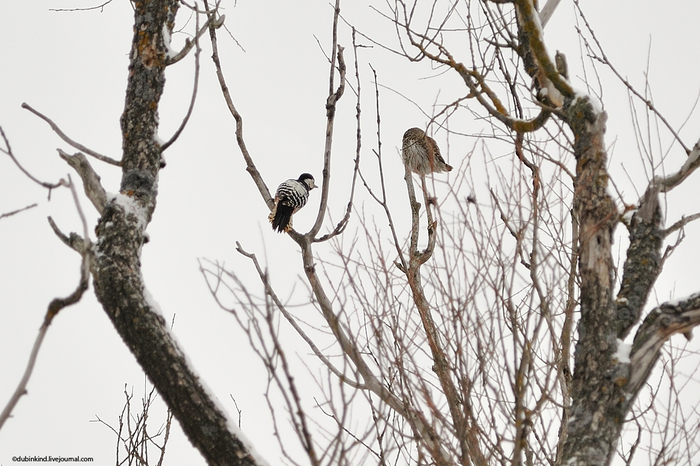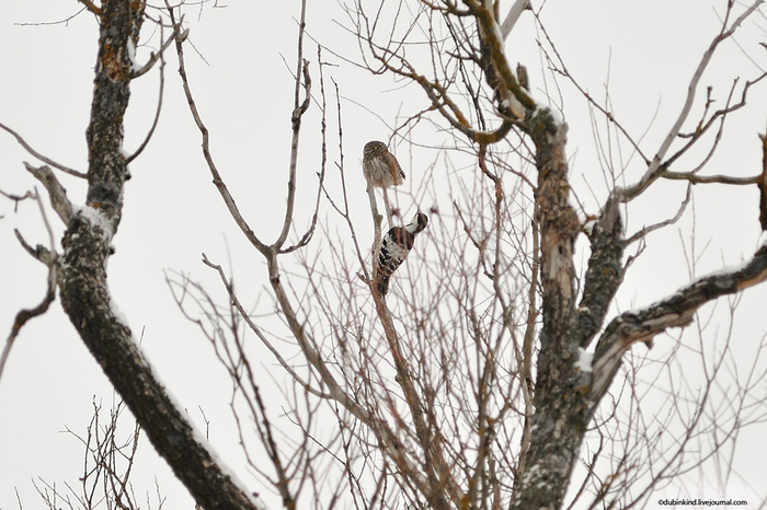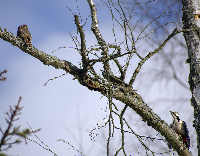 Сычиков, как и остальных сов, другие птицы недолюбливают. Вот и эта самка белоспинного дятла (если я не ошибаюсь) решила, что надо сыча прогнать.