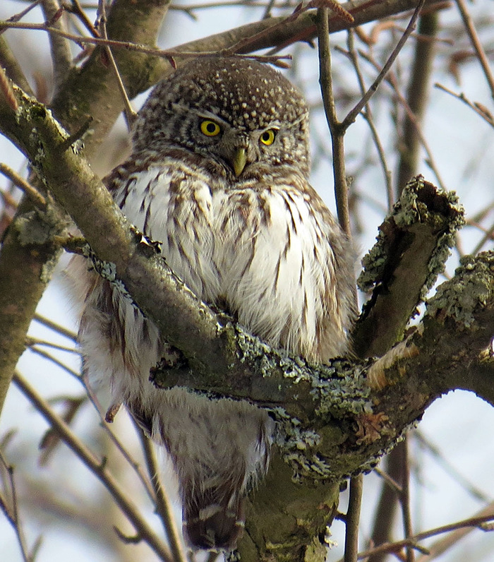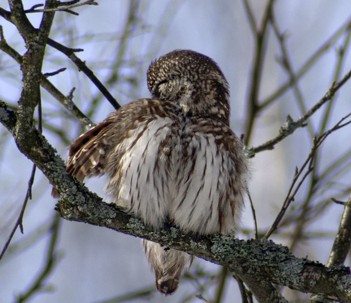 И у неё это довольно скоро получилось. На радость мне, так как сел сычик куда-то в нижний ярус. Ещё оттого радостно, (если я, конечно, не ошибаюсь), что белоспинного дятла я раньше не встречал. Но он высоко, а сычик теперь низко, пойду его искать.