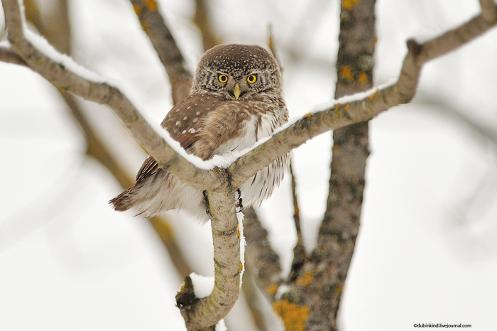 Сычика хватало минут на 10, после чего он перелетал на другое дерево метров на 20. Синиц же было не остановить, поэтому все повторялось снова. Но это мне оказалось на руку, потому что во время сидения сова проявила себя идеальной фотомоделью. Мало того, что она смотрела прямо в объектив, так ещё и подпускала к себе метра на 3. Очень любопытный попался сыч, но при этом не забывал следить и за действиями ОПГ, крутя головой на все 270 градусов. В общей сложности бродил я за ним от дерева к дереву почти час, несмотря на холод и сугробы по колено. Пока не замёрз до такой степени, что пришлось мчать домой пить горячий чай. Но фотографий и так получился целый вагон!