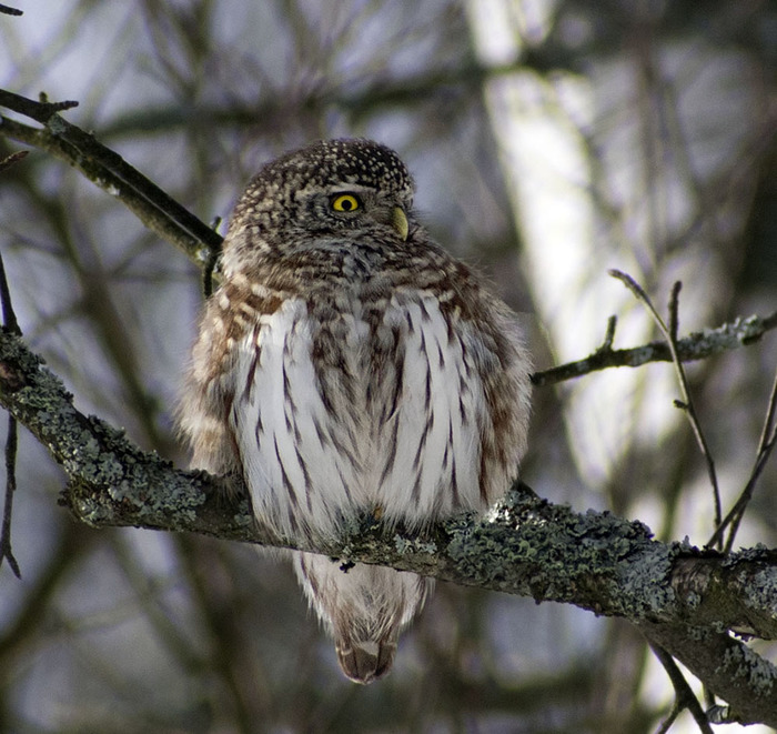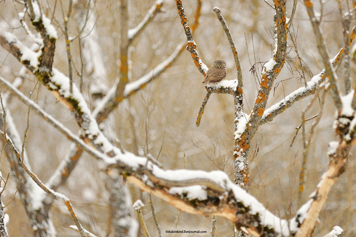 Вообще, когда небо затянуто тучами, мне почему-то становится больно на него смотреть, слезы текут ручьями и видимость почти нулевая. Поэтому пришлось помучиться в поисках ракурса на фоне леса. И найдя его, я чуть не завопил от радости, потому что оказалось, что на ветке сидел воробьиный сыч! Сделав несколько не особо получившихся фотодоказательств встречи, я просто понаблюдал за ним и потопал гулять дальше. Радости и впечатлений были "полные штаны".