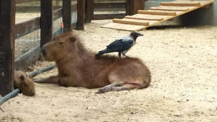 Но помимо бестолковых перепёлок, я регулярно общался со слепым вороном и наглой сорокой (после поправки он куда-то улетел, а жаль. Он был мне другом). А ещё была наглая серая ворона, которая приходила к моим капибарам, отбирала у них еду, каталась на спинах у бедных водосвинок и клевала их, купалась в их поилке. Чудовище. Приходилось регулярно её гонять.