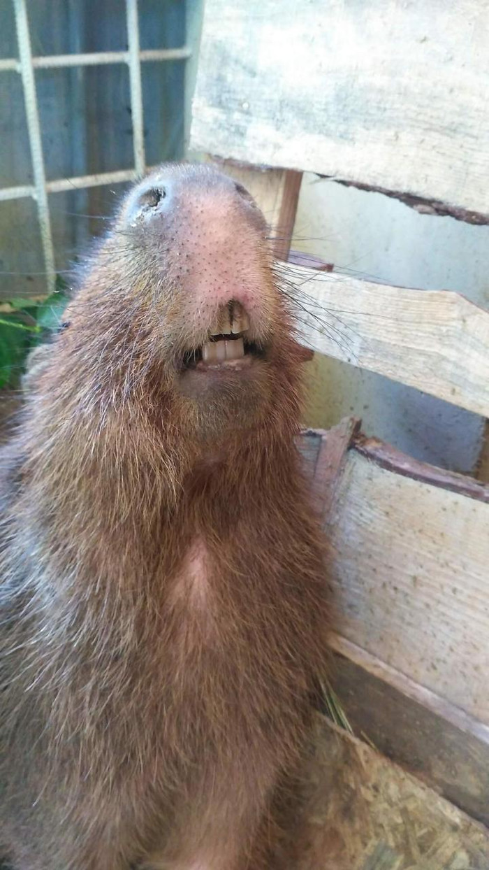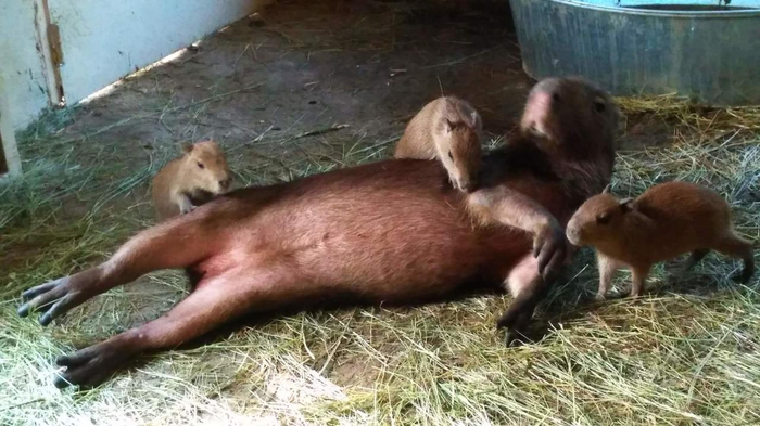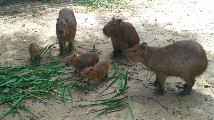 Капибар у меня в подчинении было шестеро: две взрослых самки, взрослый самец и три маленьких месячных капибарёнка.