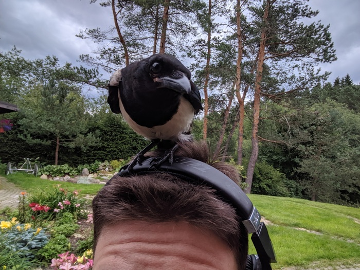 Вырастили в ванной, потом переселили на балкон. Он/она научилася летать. Мы надеялись, что улетит к стае сорок в ближайший лесок, но нет... Стоило выйти на участок, Сара прилетала общаться, ни одно действие на участке без сороки не обходилось.
