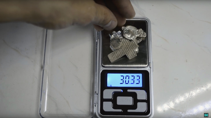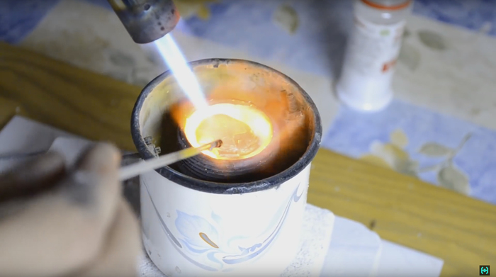 Вынимаем горячий пирог и кладем в него кусок серебра. Плавить будем в той самой выемке, что вместо тигля служит. Буру не добавляем, при застывании она превращается в стекло-подобную массу, в следствии формы невозможно будет разъединить. Серебро прогреваем очень хорошо, примерно еще минуту - полторы после того, как металл расплавится.