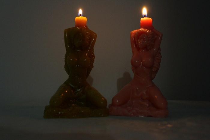 Так же из соевого воска. Получилось немного похуже синей. Нос у нее немного не отпечатался с формы)