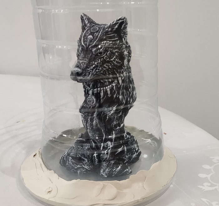 Затем полученный раствор заливаем в подготовленную опалубку со статуэткой. В качестве опалубки я преимущественно использую пластиковые бутылки. Так же необходимо обеспечить герметичность конструкции, иначе силикон вытечет, а в этом приятного мало, поверьте мне. Пару раз вытекал и вся работа насмарку шла. Для обеспечения герметичности обычно я использовал клей, но как показала практика- этого недостаточно. Поэтому с этого раза я стал использовать ещё и пластелин.