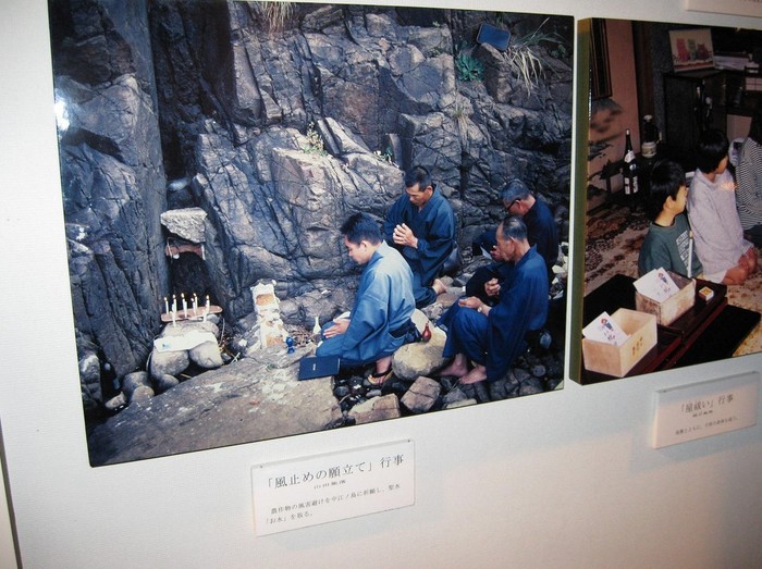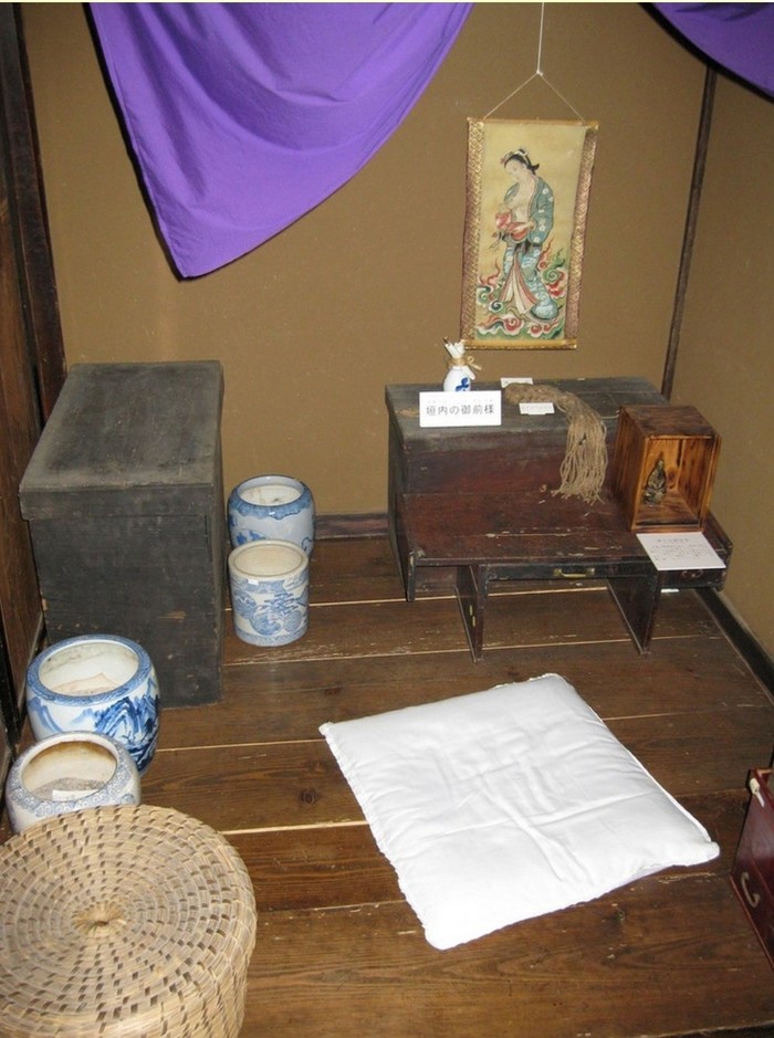 Известные как nandogami или gozensama, эти священные предметы для скрытых христиане считались goshintai - божественным священным сосудом. На стене висит икона с изображением Мадонны с младенцем.