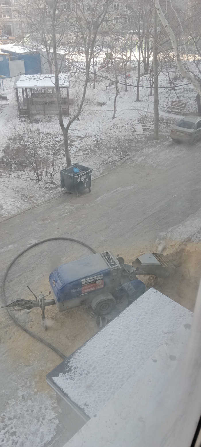 Приехали ребята, все посчитали ещё раз, и через неделю приступили к работе. Привезли под подъезд кучу песка и цемента в мешках, подогнали чудо - аппарат, которым раствор на этаж подавали.