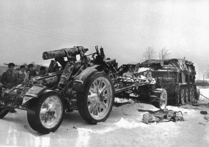 Разгром немцев под Москвой. Брошенное немцами артиллерийское орудие в районе города Клин
