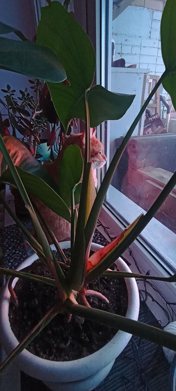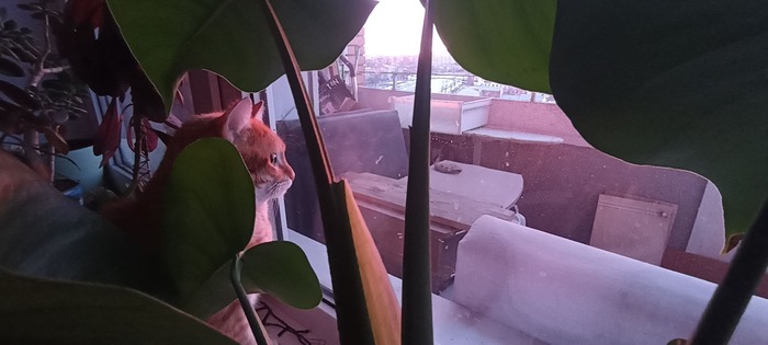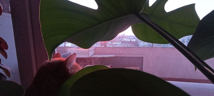 Гербик - большой специалист по наблюдениям, и этим утром он выбирает тёплое и живописное местечко под монстерой.