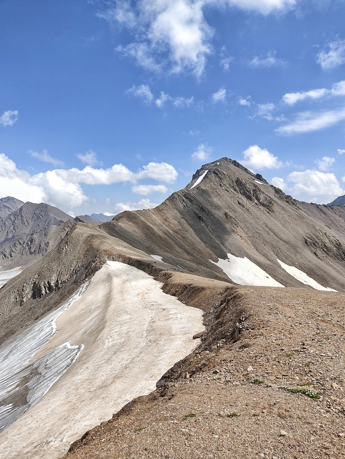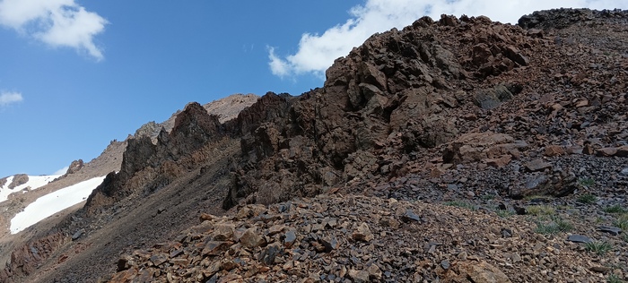 При выходе на гребень уже видна двуглавая вершина и цирк. Истинная вершина 3864 м справа. Здесь хорошо виден цвет камня. К осени, когда снег уже практически тает, а новый еще не выпал, эта гора очень напоминает марсианские пейзажи из-за своей окраски, чем мне очень нравится. Позже выложу осенний, октябрьский поход на эту гору.