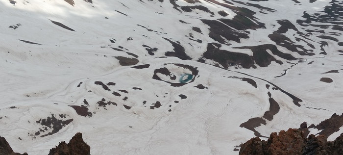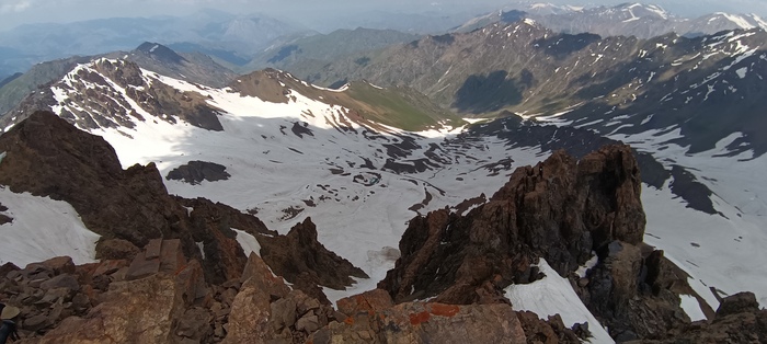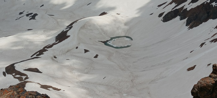 Виды с вершины в сторону верховьев Тереклисая и перевала Тереклисай. Хорошо видны небольшие ледовые озерца: