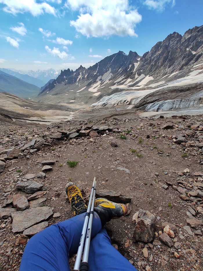 Тут начались уже морены, скалы и сыпучки, в целом, все справились на отлично.
