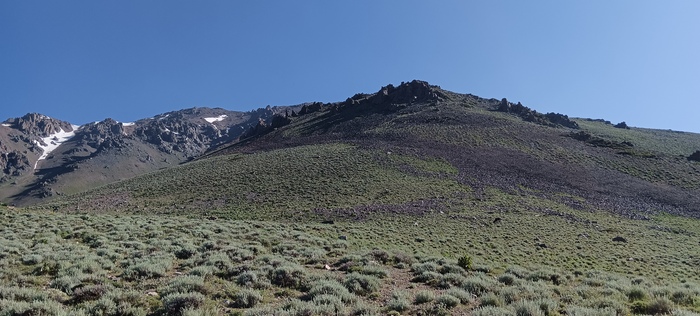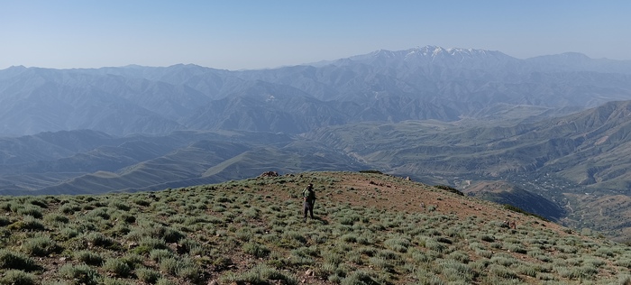 Весь подъем на гору - относительно короткий, но с резким набором высоты и сыпучий - множество мелких камней с растительностью. Троп, ведущих вверх, практически нет. Имеются только бесполезные для нас пастушьи тропы. На фото мы на высоте примерно 2300 м, внизу виден поселок Эрташ, на заднем фоне справа - гора Бабайтаг 3555 м: