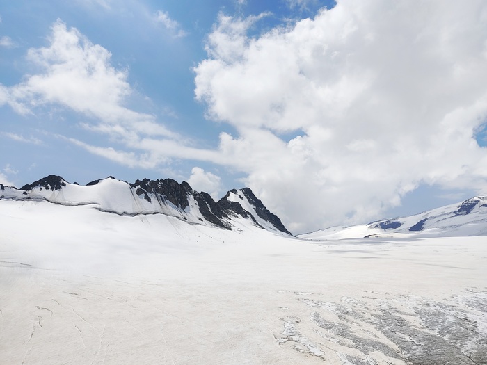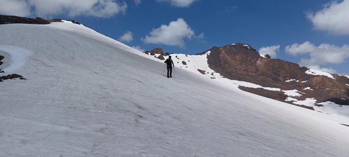 Небольшой, но довольно тяжёлый подъем по снегу. Ранее так не ходила, ноги проваливались, съезжали, что отнимало много сил. Шли медленно, высота была уже приличная, воды, естественно, не было на пути, а снег с горы есть не желательно, потому, что он очень грязный, да и жажду он не утолит.