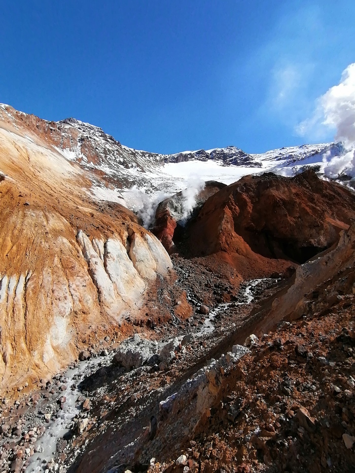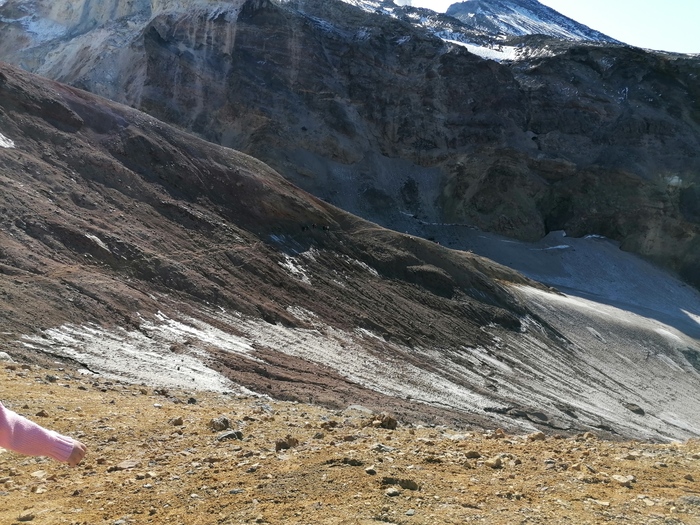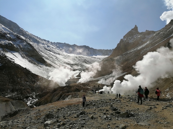 Боюсь наскучить, поэтому перейдем к Точке назначения. Сюда дошел - герой, на Камчатке побывал) Но это не активный кратер вулкана, а его преддверие. Активность вулкана в основном заключается в фумарольной деятельности. Фумарол - это грубо говоря дырка в земле из которого под давлением вылетает газ. Воняет интенсивно серо-водородом. В клубы не рекомендуется заходить, долго дышать, поскольку отравление вещь неприятная. Ну я и не рискнула, при такой то дороге обратно..