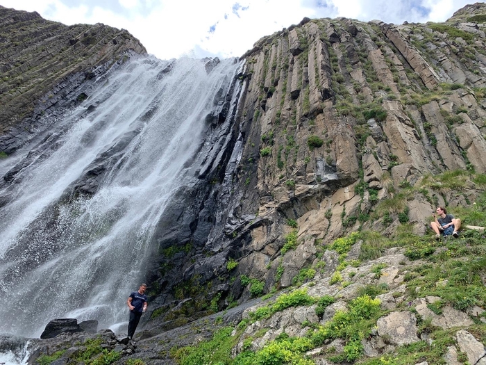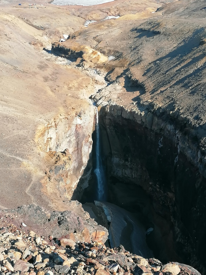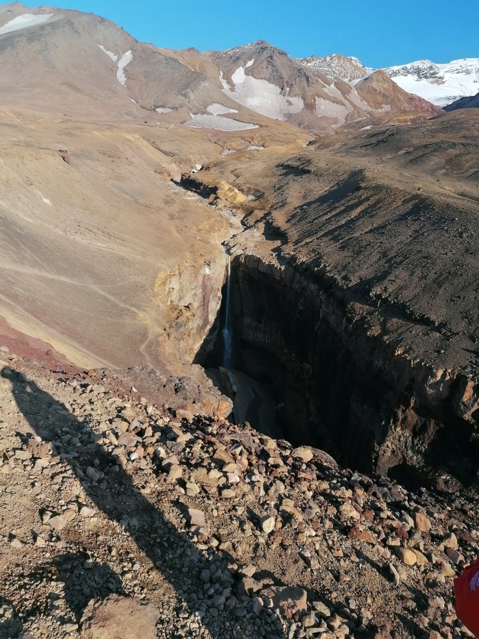 Надежда на легкий обратный путь под уклон меня покинула на первых 100 метрах.. Во-первых спускаться тяжелее, тянет понимаешь вниз побежать.. Да и мышцы работают другие и они тоже охреневают от окружающих красот.. В общем мне скоро захотелось опять в горку идти.. Добрались с божьей помощью и такой то матери. Небольшой перерыв и мы переехали на пару км подальше к каньону (оврагу) Опасный. Те мутные воды вулкана, протекают под ледником и спадают в каньон, большим, хоть и худым водопадом.. На первой фото овраг слева.
