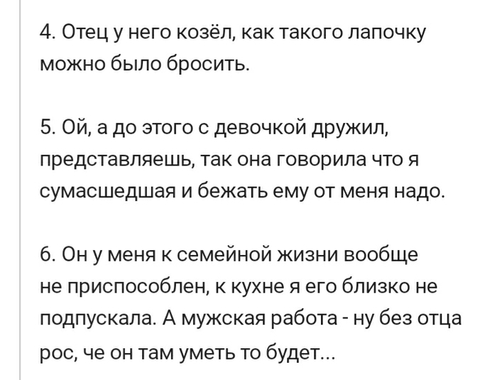 Я сидел дома никуда не ходил и после того как это продлилось очень много времени. Я ни с кем не общался. Ко мне подошел отец и наорал на меня и кинул меня на с одной стороны комнаты на другую и ушел орал и плювался себе под ноги. После того как я лежал в психушке я ходил ко всем друзьям и после этого они меня не звали никуда, разорвали связь со мной, абсолютно все. С начала всего меня теперь постоянно ударяют бьют. На меня поднимали руку когда я что то делал не так раз 8 уже. Раз 10 даже, ногами руками. Орут на меня. Недавно отец меня избил когда я ходил в баню, потому что я не мылся целиком а потому что мыл только голову, он начал орать и говорил что бы я мылся целиков. Потом окатил меня из тазика на одежду прямо. И ударил по лицу телу раз пять почти в полную силу. У меня везде синяки были. Он постоянно ходит орет, забирал карточку с пенсией. Постоянно орет на меня и запугивает и даже когда я покупаю пепси раз в месяц у меня хотят забрать карточку и говорят что я покупаю себе Пепси рулеты, трачу деньги куда то. Моя мать тоже меня уже раз пять нахлабучить успела ногами, руками, орет и говорит что я тебя в психушку отдам. Я говорил друзьям что у меня картинка пропала перед глазами, но они все равно мне не звонят. Я говорил родителям через два года что со мной что то произошло, но мать мне ответила, ты Папе говорил, а? Скажи это папе лучше интересно что он скажет. Я писал ей из больницы, что у меня картинка в глазах пропала. Но она сказала что не может быть и все на этом забыла. Недавно я сказал ей что меня отравили, она говорит ага уже отравили. Я кричал ей и говорил что почему ты мне не веришь? Она говорила ,дословно Ой Всё, замолчи! Я ей сказал что не помню ничего, она начала проверять меня, бабушку помнишь, я сказал что нет, а дедушку я сказал что тоже нет. Мне постоянно указывают что делать. Компьютер уже ломали 3 раза с ноги, из за того что я только за ним и сижу. Я ходил к друзьям и одной компании. Сначала я ходил встречался с ними, все было нормально. Но однажды я пришел и мне задали вопрос, Дословно, ТЫ че вообще о себе думаешь? Это задал новый кореш блатной в компании, а друг добавил, собирай свои монатки и уебывай отсюда. Я общался с парнем с больницы, но он намекнул что не хочет со мной общаться. Другой друг, я ему рассказал и про память и про картинку в глазах, но так и бросил меня. Спрашивает что говорят врачи, родители. Но все на улицу он меня не зовет. И не пишет и не отвечает теперь. Другой друг, когда я ему написал, сказал мне что он знает меня, поэтому со мной ничего плохого не происходил что я придурок тот еще, поэтому говорит что я загнался, говорит сходи к психологу. Написал мне 5 пунктов, что делать. Он говорит что я не болею ничем. Еще один друг сказал мне, что я конченный вообще если, Дословно, когда я в бреду писал ему что ходил к его девушке что бы переспать с ней. Другому другу я писал, он сказал что сейчас слышит нормального здравого пацана, что ничем я не болею тоже. Сначала он говорил что я могу с ним встречаться потом сказал что меня не найдешь ты. Я встретился недавно с другим другом у которого по Залету дочка растет, который отсидеть успел. Я рассказал что меня отравили. Я дал ему 500 рублей на пиво, он попросил 3 тысячи рублей долг и сказал что отдаст вечером. Но он все кинул меня на деньги,в тот же день, он так и не отдал мне их спустя 3 недели. Каждый день когда ему звон