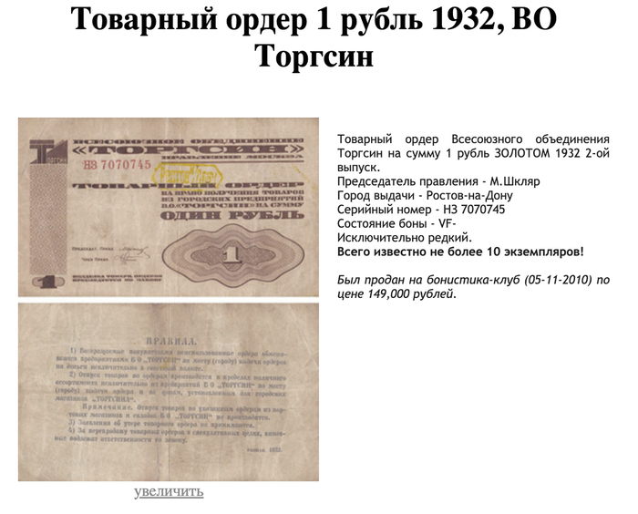 Из публичных продаж крупных номиналов - известны несколько продаж в 2010 году номинала 1 рубль 1932 года за 135 и 149 тысяч рублей. Одинаковый штамп Ростов-на-Дону говорит о том, что боны видимо были из одной заначки. Скромная сумма ухода связана с тем, что лот продавался на низко ликвидной для такой уникальной вещи площадке. Ну и безусловно покупателю просто очень повезло!