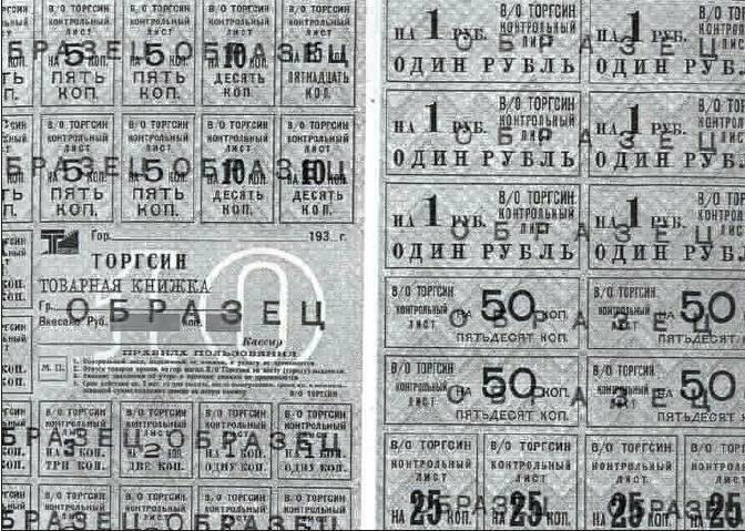 Яркими историческими документами являются Чеки Торгсина - именно на них менялось спрятанное населением царское золото и ювелирные украшения, а уже за эти чеки отпускались товары. Существовали чековые книжки и самостоятельные чеки, с указанным на них номинале.