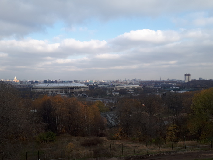 Мой путь теперь лежал вдоль улицы Косыгина до Гагаринской площади. Вон, на картинке сквозь листву справа виднеется здание президиума Российской академии наук - мне туда. Улица уже сама по себе красивая и изящная, но на ней также находятся несколько изумительных и очень известных видов Москвы, открывающихся с "обзорной площадки". Это вид на Лужники и, в обратную сторону, вид на МГУ.