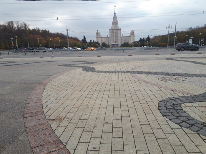 Площадь Индиры Ганди на пересечении Мичуринского и Ломоносовского проспектов ожидаемо встречает меня неплохим видом на "главный ВУЗ страны". Мы ещё увидим МГУ с более привычного "открыточного" ракурса, обойдя его территорию по ровно половине периметра. Но шпиль главного корпуса, в резавшийся в серое московское небо, будет сопровождать мой путь ближайшее время. Вокруг, я знаю, много достопримечательностей, к которым можно было бы сходить, и да, меня очень сильно подмывало сделать один-другой крюк для этого. Но нет, основная цель важнее.