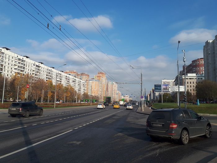 Солнцево не Лучанск, а Воробьёвы горы не Удоево, но всё же. Мичуринский проспект - это одна из больших "вылетных магистралей" столицы, протянувшаяся прямой линией от Москва-реки почти что до МКАДа. Мне предстояло пройти его вдоль от конца к началу. Благо, для пешехода эта дорога приспособлена куда как лучше Озёрной улицы, МКАДа и даже Боровского шоссе. На всём протяжении проспекта лишь в нескольких местах широкий тротуар примыкает непосредственно к проезжей части и становится шириной чуть больше полутора метров. В остальное же время пешеходная зона - это отличная дорога, на которой с лёгкостью могут разъехаться две колесницы, чем некоторые несознательные граждане пользуются во время пробок. Но не о них сейчас.