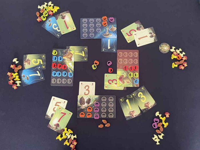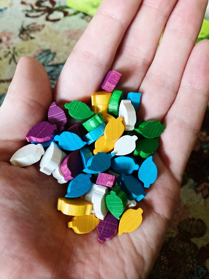 Семейная игра от Gaga games. Играли максимальным составом — вшестером. Правила назубок не знал никто, но примерно к трети партии постепенно вычитали и уточнили в правилах все немногие нюансы, что есть в игре, и пошла бескомпромиссная борьба за победные очки.