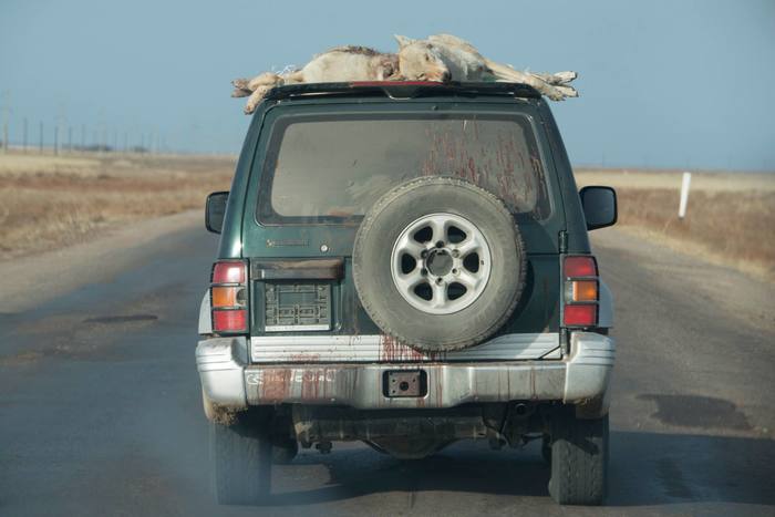 Еще одно интересное наблюдение: встретили джип без номеров, на крыше которого были привязаны два огромных матерых белых степных волка.