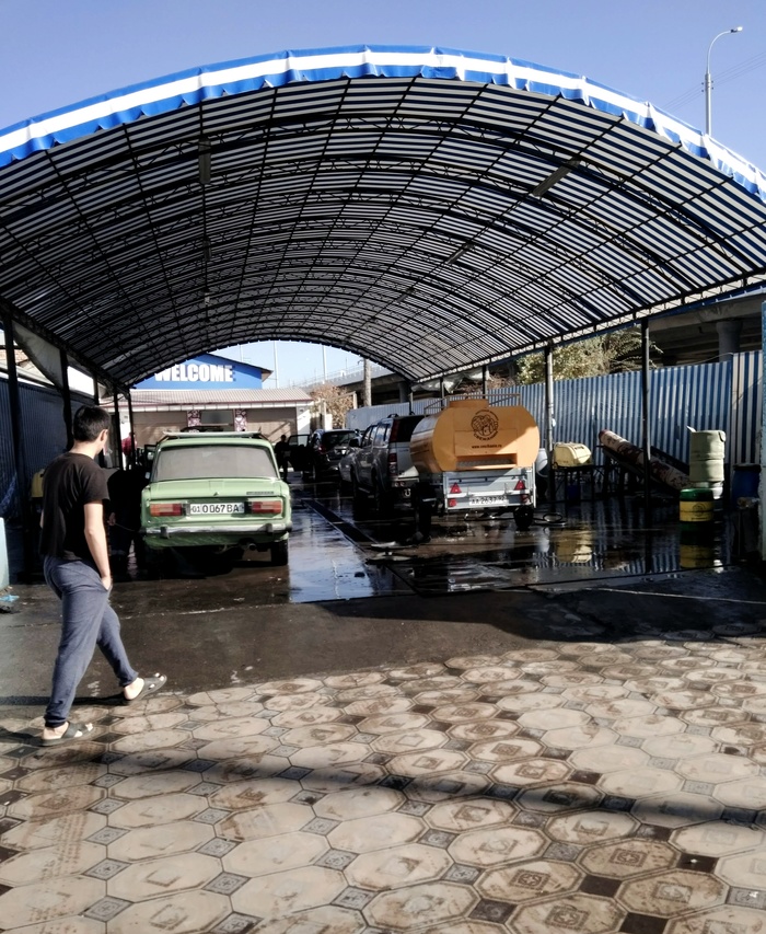 Ташкентская автомойка – суть явление удивительное и какое-то… домашнее. Под большим навесом в 2 ряда встраиваются 6-8 авто, и мойщики поливают их из шлангов и протирают тряпками.